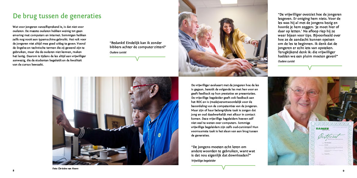 Ontwikkeling logo en huisstijl, beeldconcepten, website landelijk initiatief, intranet en forum voor vrijwilligers organisaties, individuele sites voor lokale Samen Online initiatieven en online cursusboek.